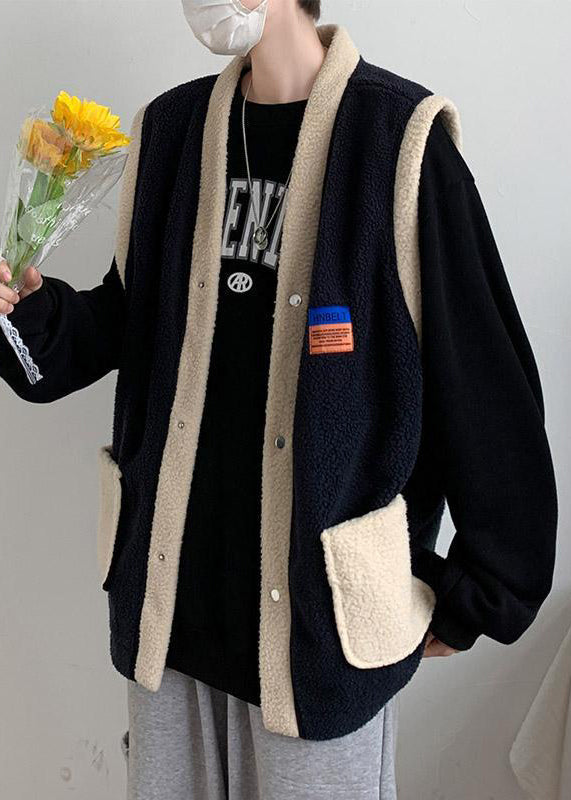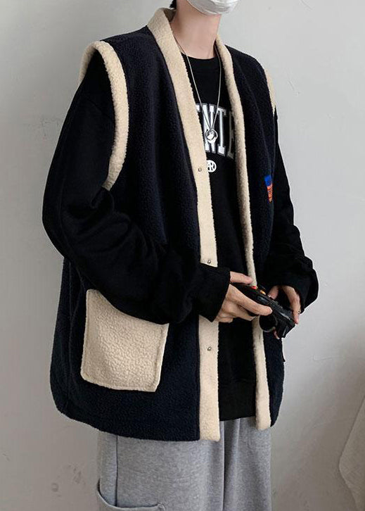 Black Pockets Patchwork Teddy Faux Fur Mens Waistcoat V Neck Sleeveless RJ036