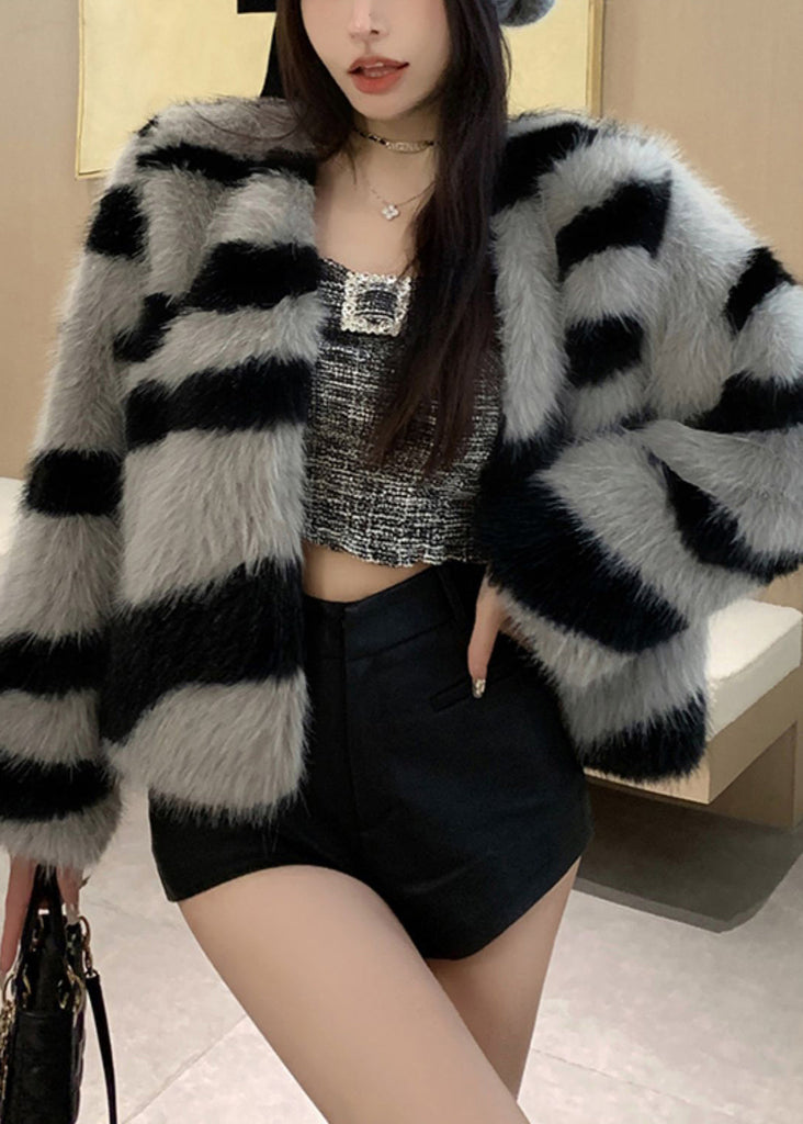 Women Grey V Neck Striped Fuzzy Fur Fluffy Coat Winter RH036