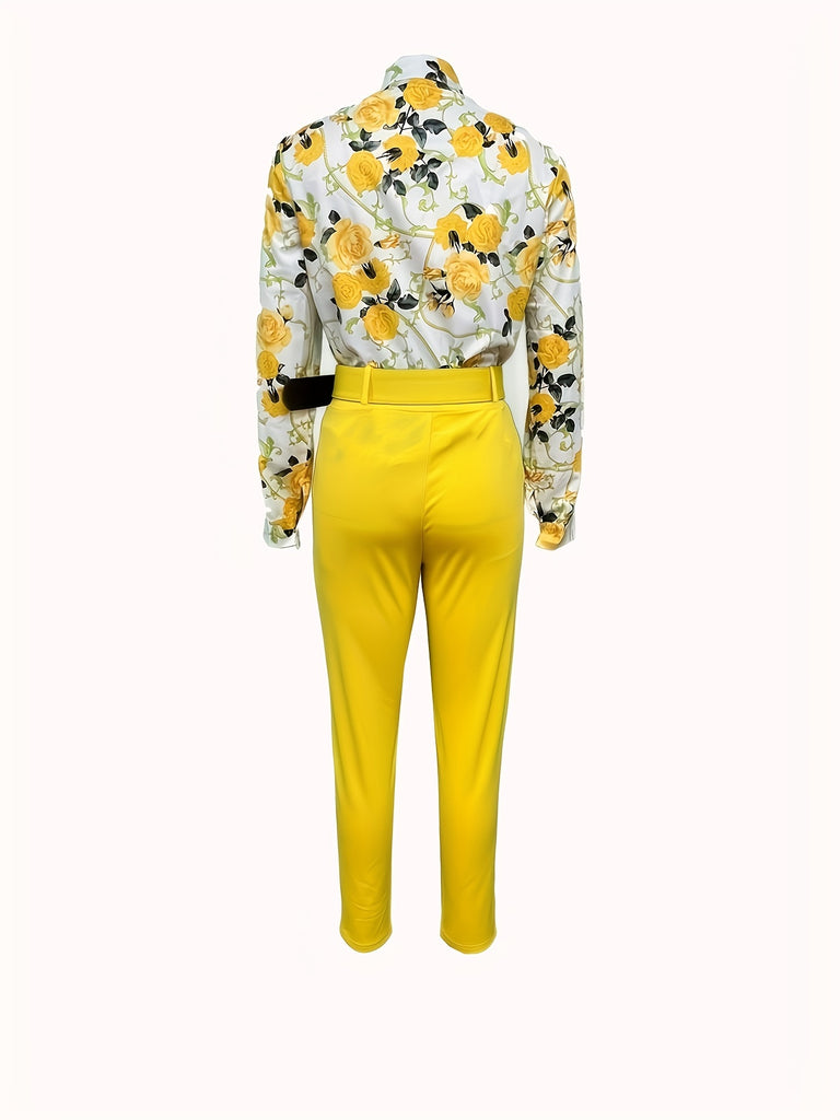 Floral Print V Neck Long Sleeve Blouse & Solid Belted Tapered Pants TD0870