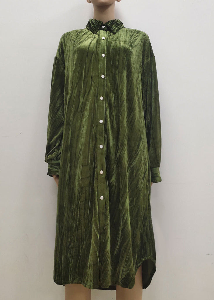 2022 Womens Ins Temperament Skirt Fashion Button Long Seeve Shirt Dress Green