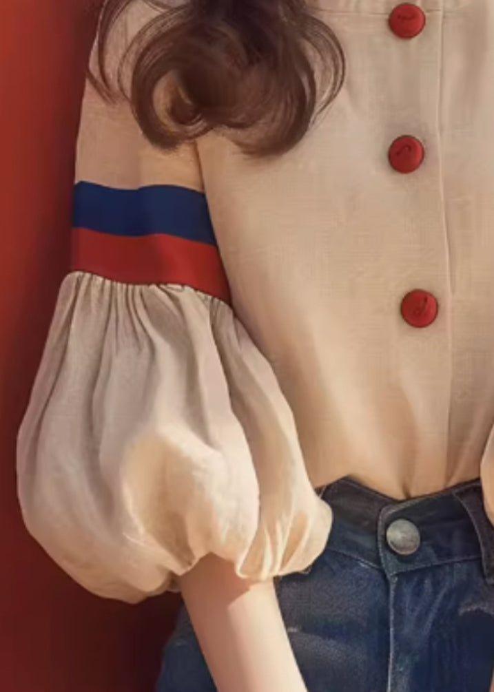 Apricot Patchwork Sleeve Cotton O-Neck Blouse Lantern Art