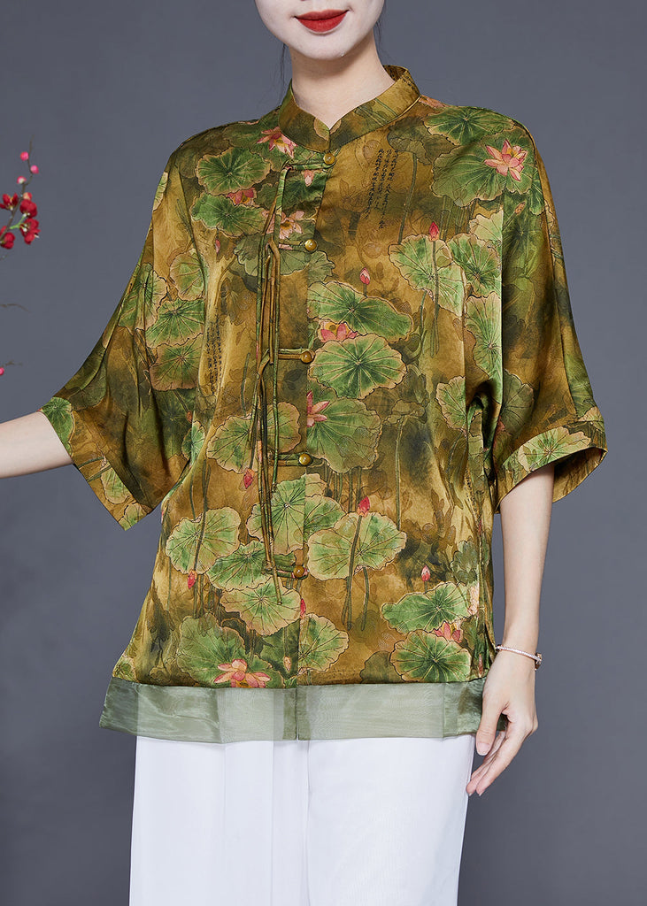 Art Light Green Stand Collar Patchwork Print Tassel Silk Top Half Sleeve LY1776