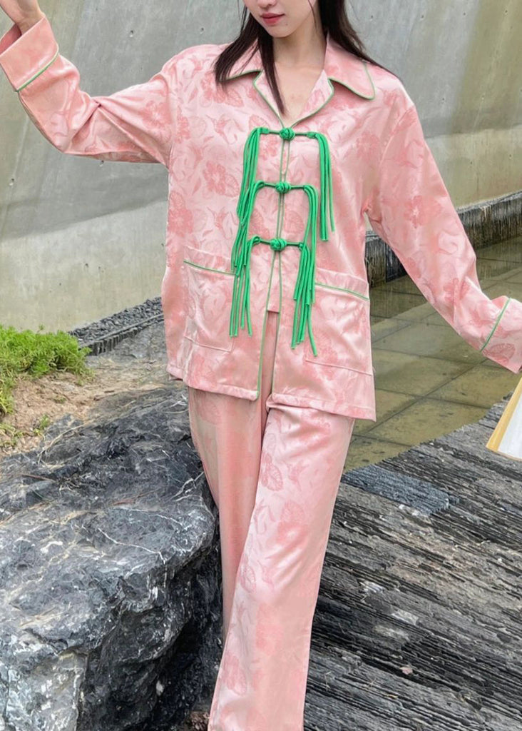 Beautiful Pink Peter Pan Collar Print Button Ice Silk Pajamas Two Pieces Set Spring