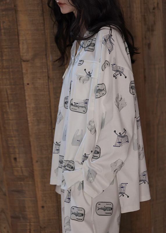 Beautiful White Peter Pan Collar Print Button Cotton Pajamas Two Pieces Set Spring