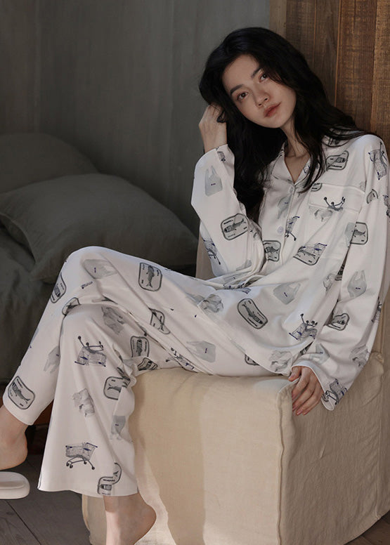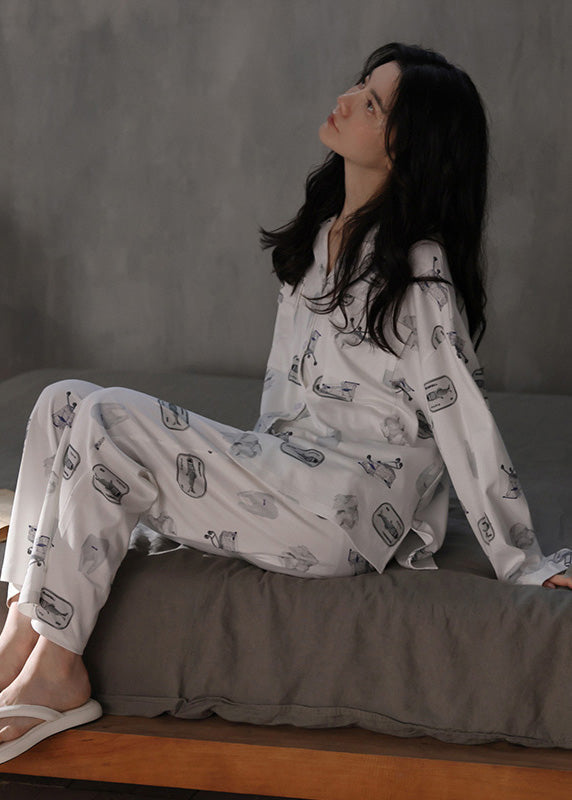 Beautiful White Peter Pan Collar Print Button Cotton Pajamas Two Pieces Set Spring LY1890