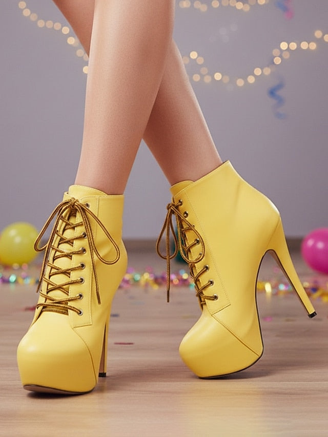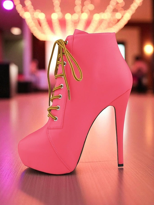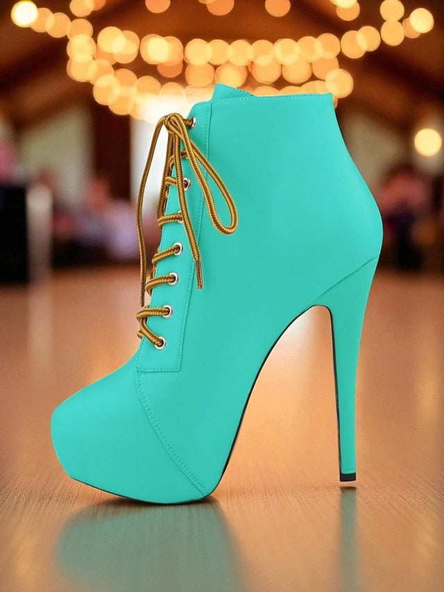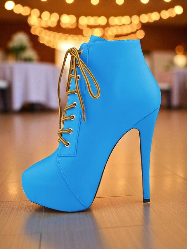 Gender: Women's, Category: Boots, Style: Fashion, Bohemia, Vacation, Sexy, Type: Booties Ankle Boots, Occasion: Party, Wedding, Toe Shape: Round Toe, Upper Materials: PU, Lining Materials: Synthetic Leather, Outsole Materials: Rubber, Platform Height (inch): 1.57, Season: Winter, Fall, Summer, Spring, Size Suggestion: standard size, select your usual size, Closure Type: Lace-up, Heel Height(inch): 5.5, Heel Type: Platform, Stiletto,