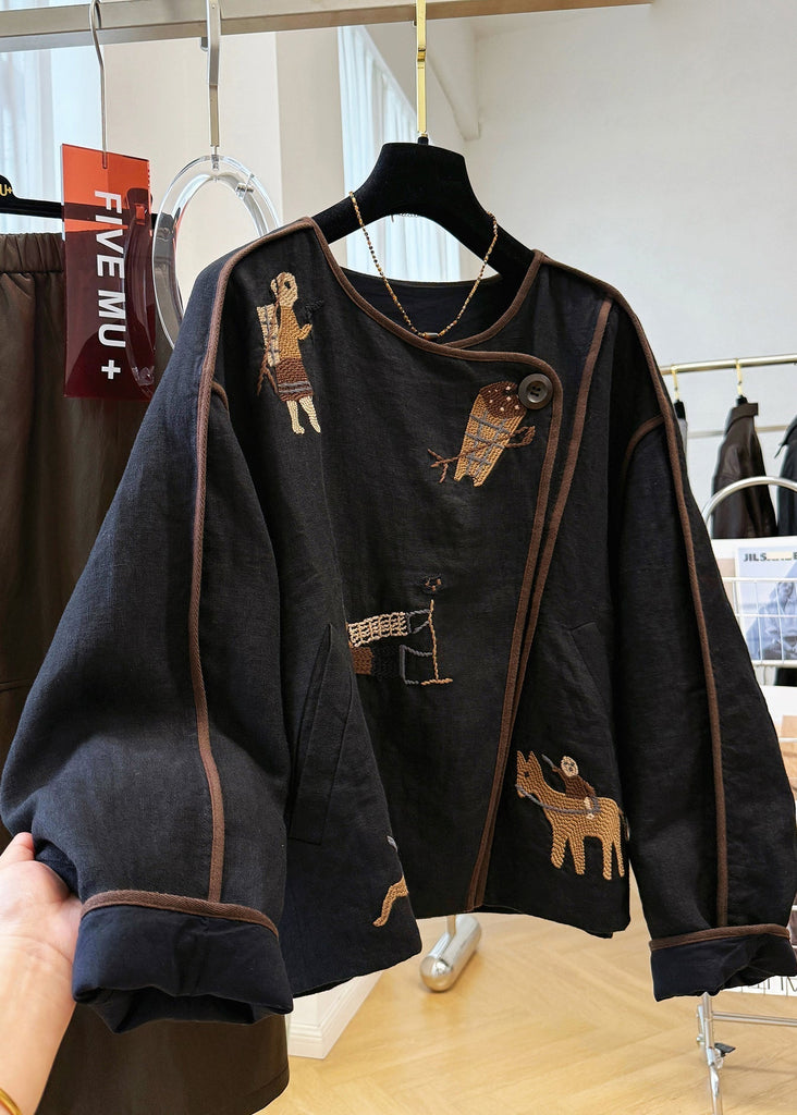 Handmade Black O Neck Embroidered Patchwork Linen Coat Fall