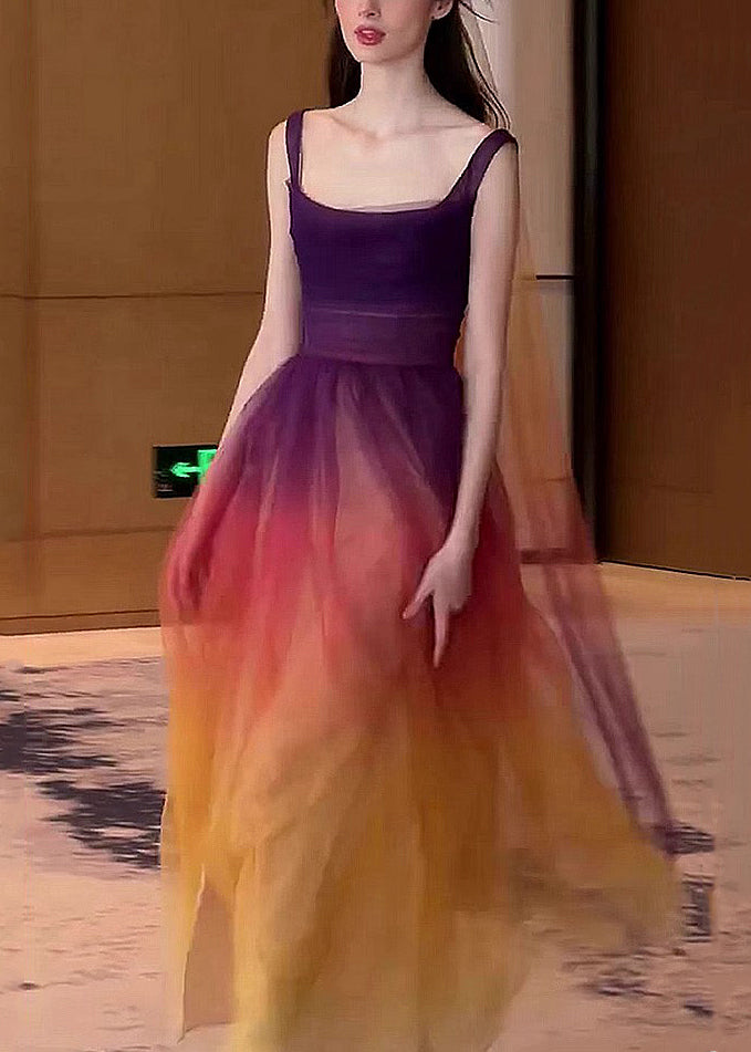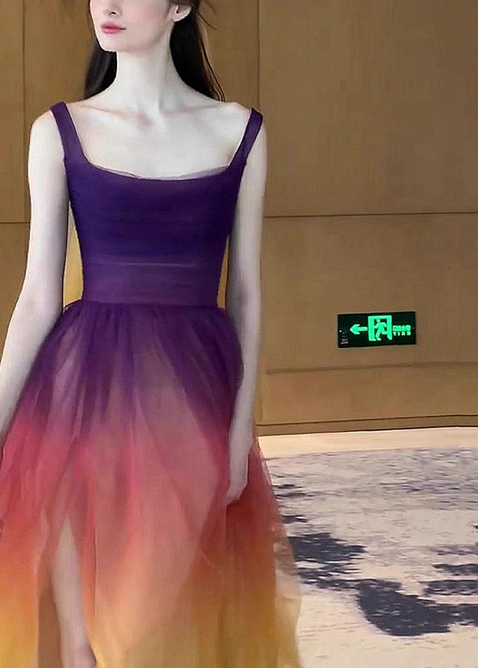 Experience the effortless beauty of our Boho Gradient Color Side Open Tulle Spaghetti Strap Dress, sleeveless and perfect for any occasion.