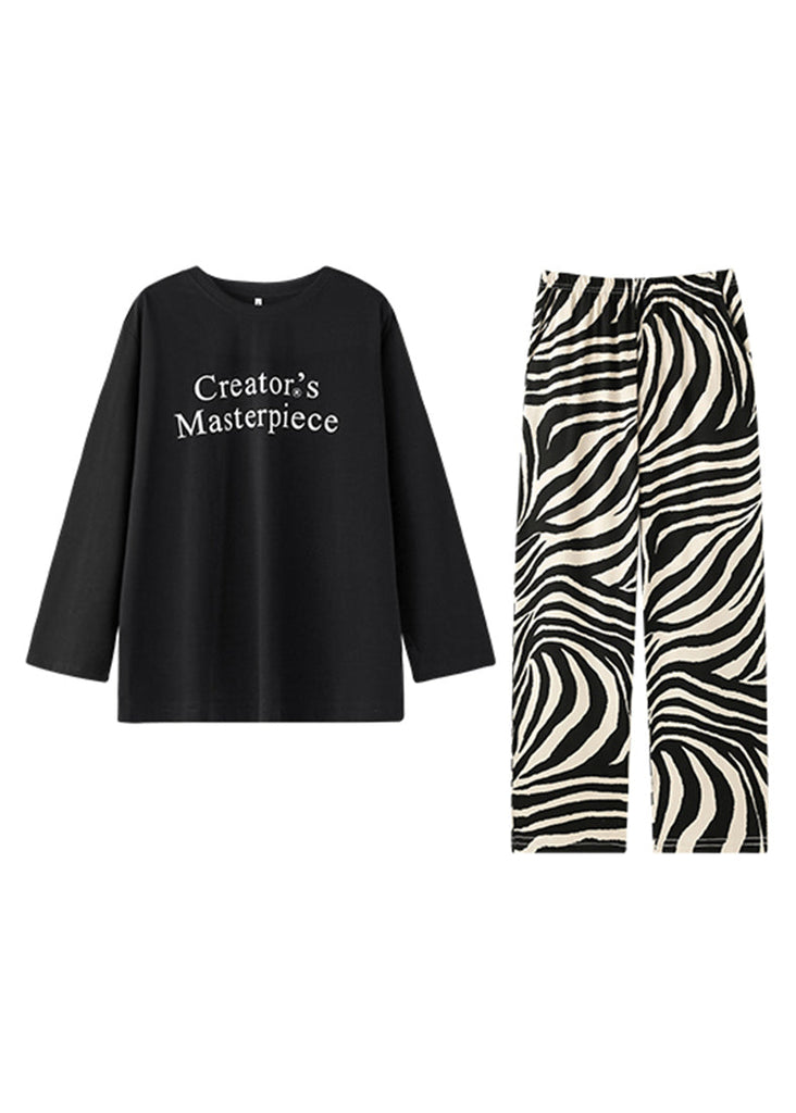 Casual Black O-Neck Graphic T Shirts And Straight Pants Two Pieces Set Long Sleeve XS1012