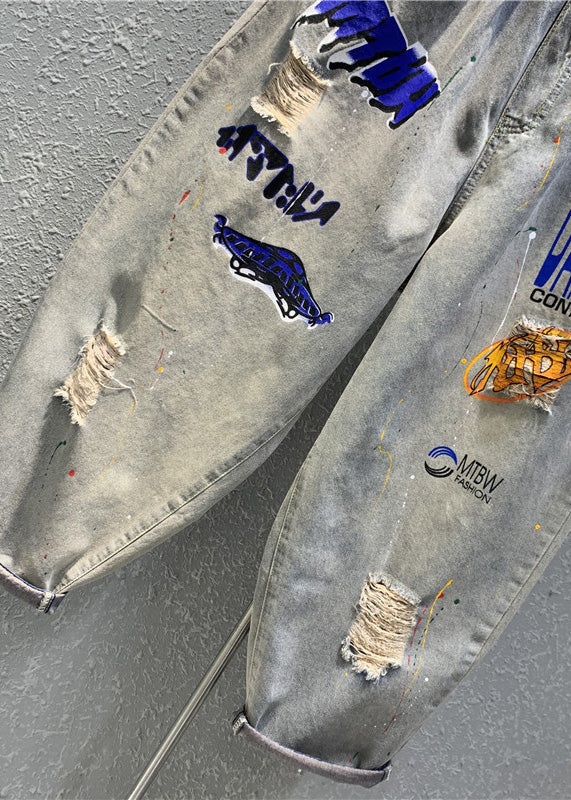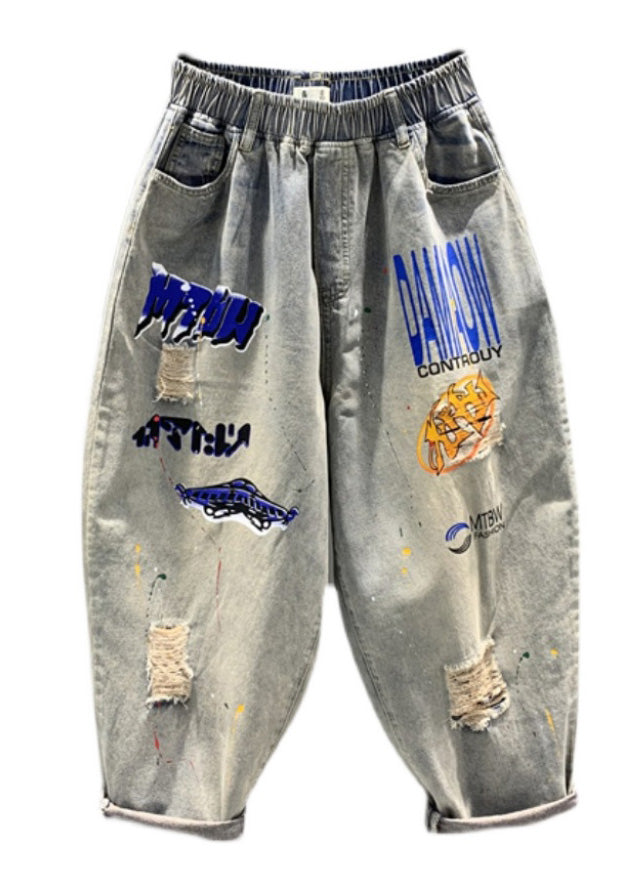 Casual Light Grey Print Patchwork Crop Lantern Jeans TY1035