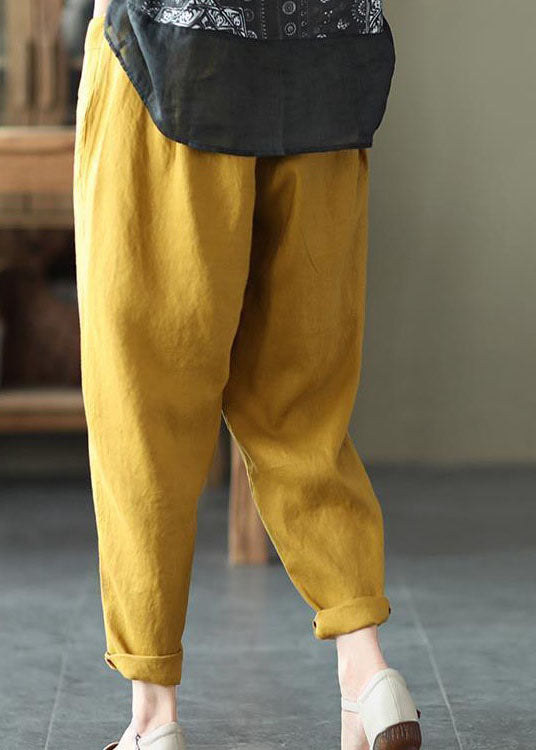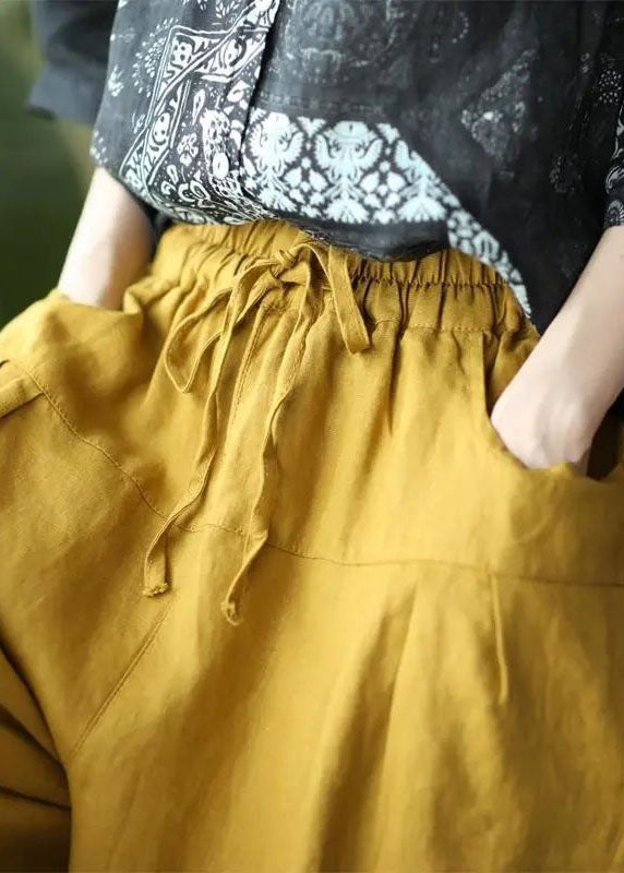 Casual Yellow Pockets Patchwork Elastic Waist Linen Pants Summer