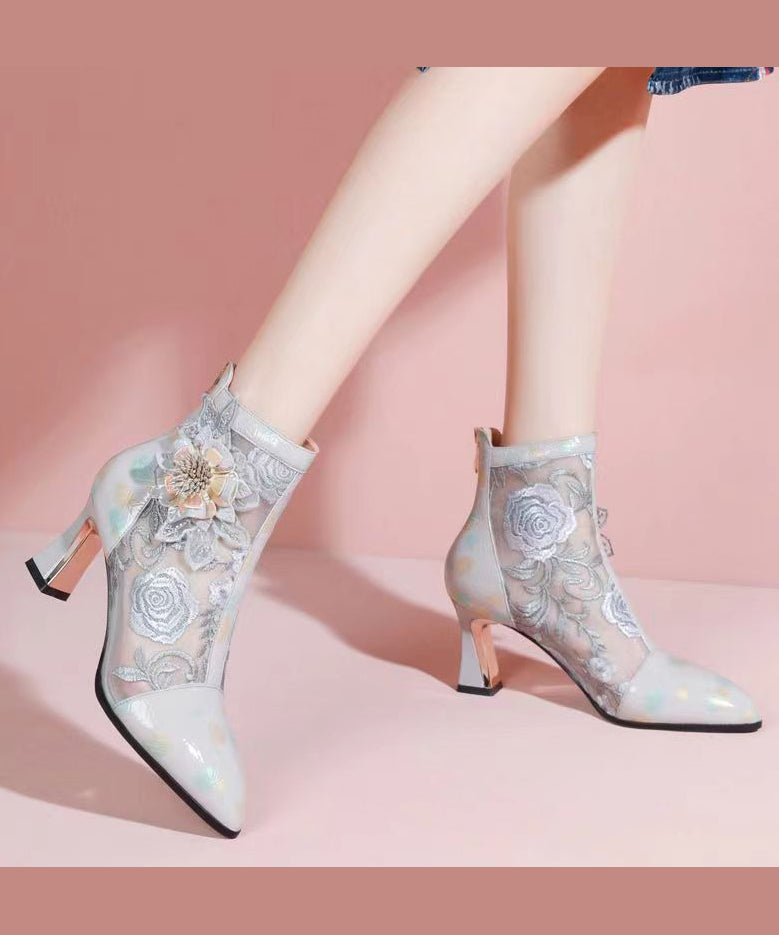 Chinese Style Embroidered Mesh Patchwork Chunky Heel Boots CZ1029