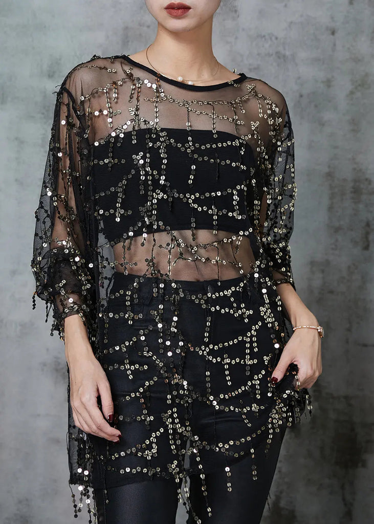 Classy Black Sequins Hollow Out Tulle Tops SummerFabric: Tulle