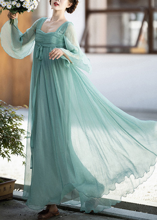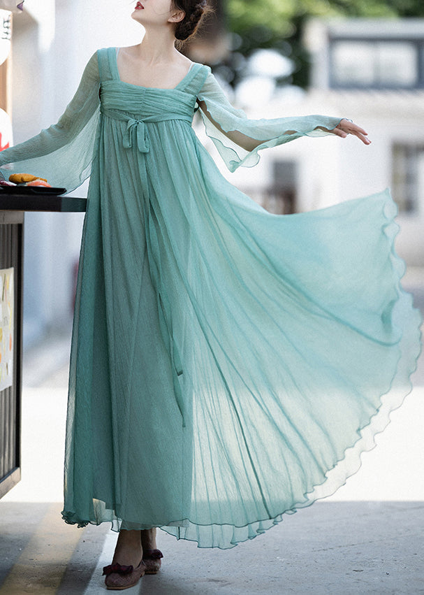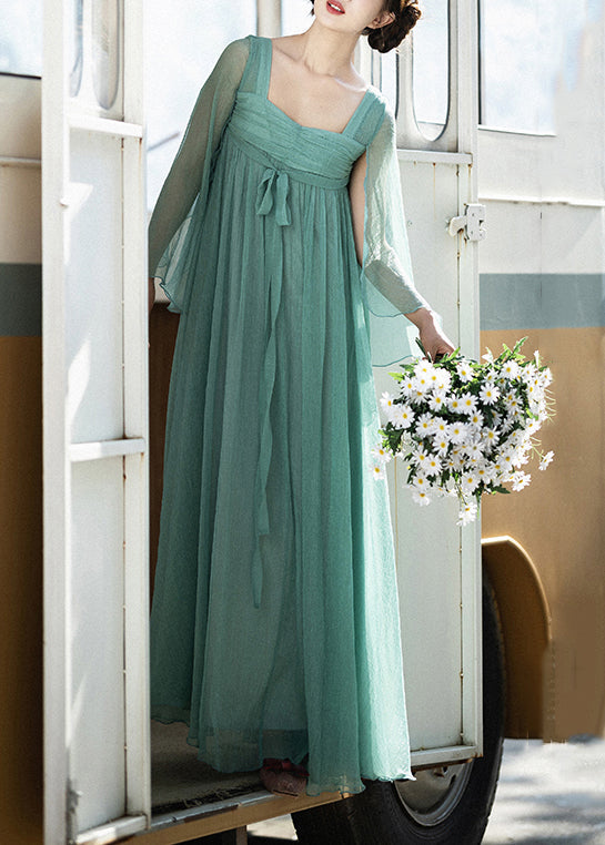 Classy Green Square Collar Wrinkled Lace Up Chiffon Dresses Summer QA1063