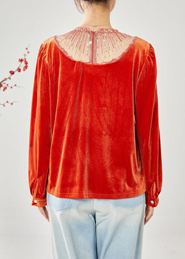 Classy Orange Hollow Out Patchwork Sequins Silk Velour Shirt Tops Spring
