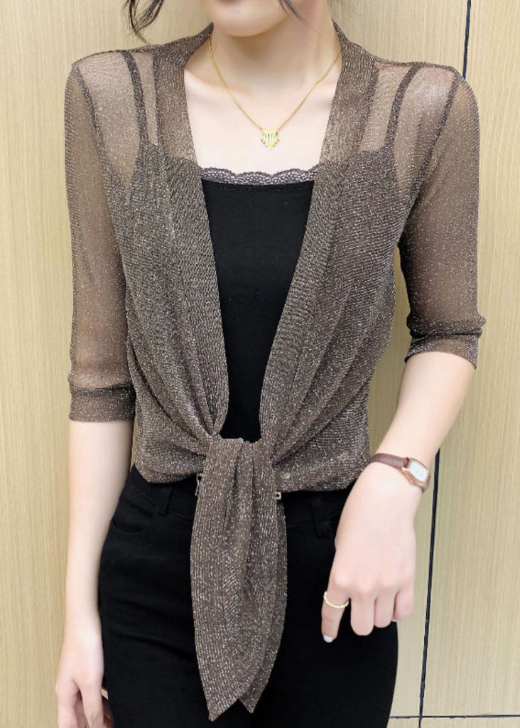 Coffee Lace Up Tulle Cardigan V Neck Half Sleeve AS1077