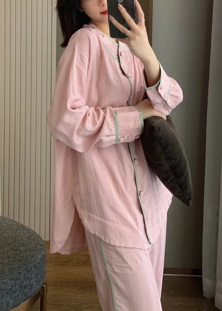 Cute Pink O-Neck Button Side Open Solid Ice Silk Pajamas Two Pieces Set Spring