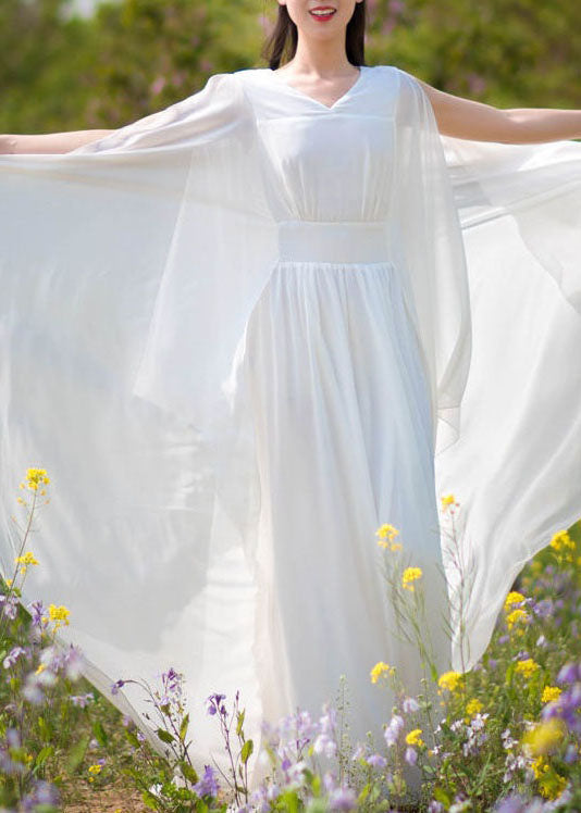 Diy White V Neck Wrinkled Patchwork Chiffon Dresses Summer LY1693