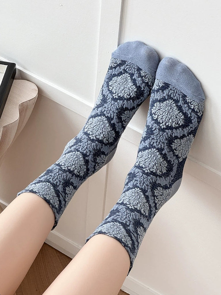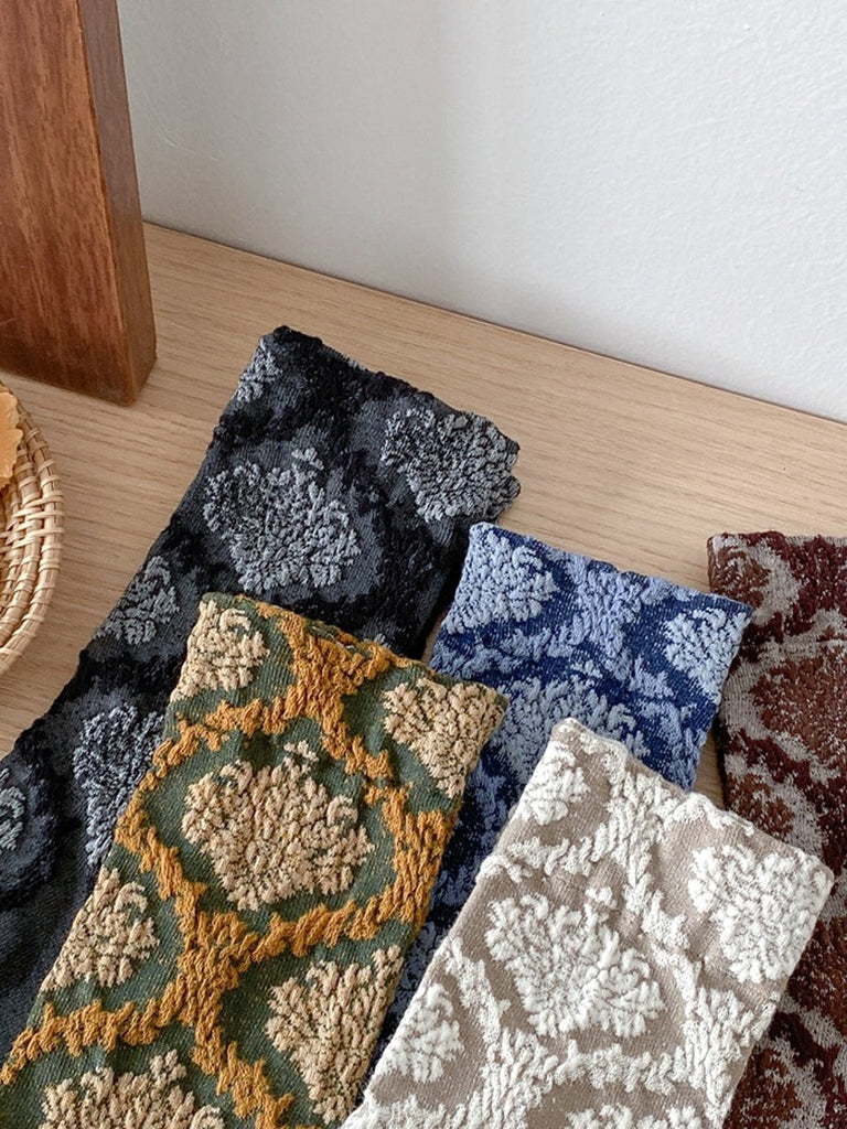 Embossing Women Pairs Socks 5 Artsy Flower Mid-Heel
