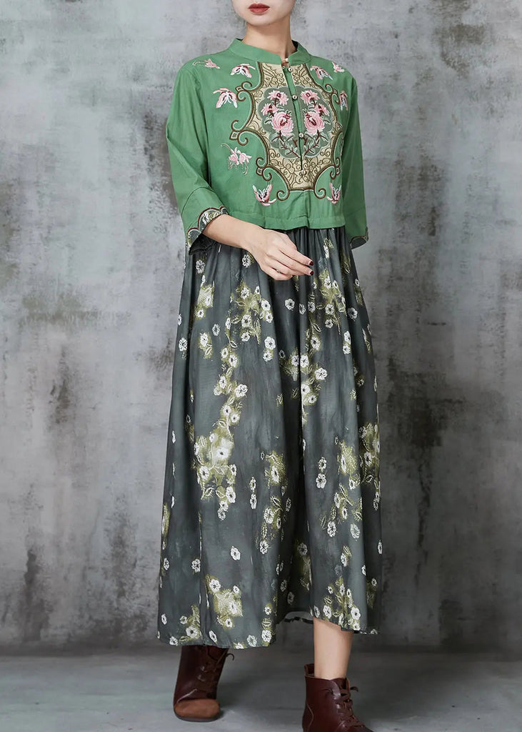 Fine Green Embroidered Patchwork Cotton Vacation Dresses SummerFabric: Cotton 45%, Linen 55%