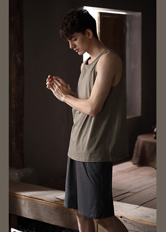 Fine Khaki O-Neck Cozy Cotton Couple Pajamas Two Pieces Set Summer