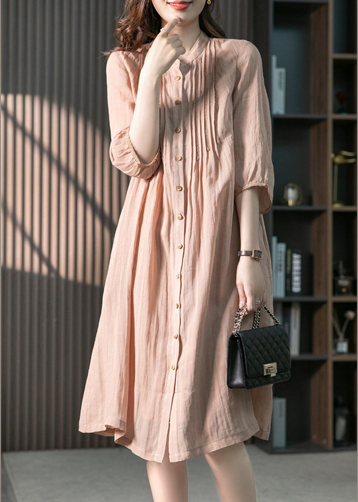 Fitted Pink Stand Collar Button Linen Maxi Dresses Spring LY1745