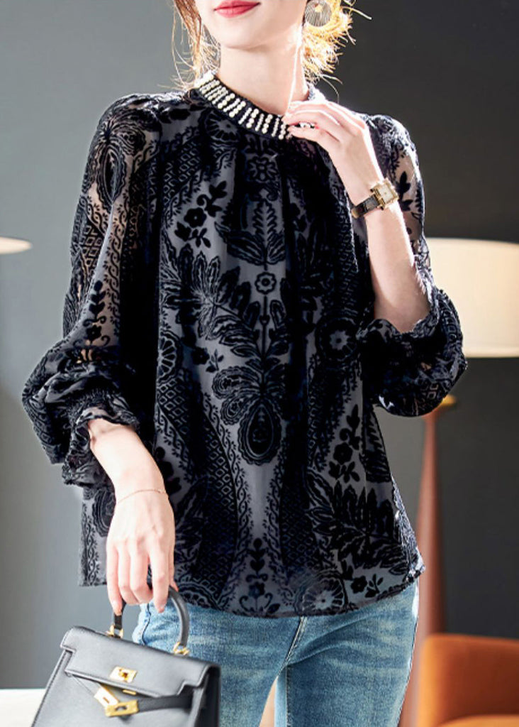 French Black Nail Bead Silk Velour Top Long Sleeve QA1050