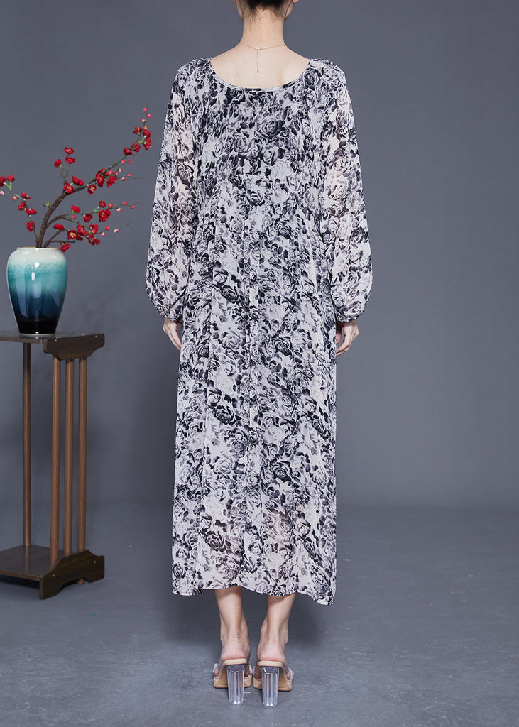 French Black Square Collar Oversized Print Chiffon Long Dress Lantern Sleeve
