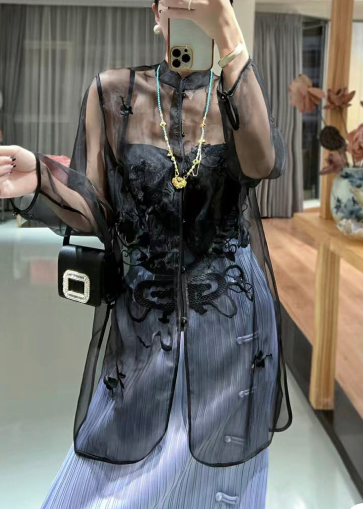 French Black Stand Collar Embroidered Button Tulle Top SummerFabric: Tulle