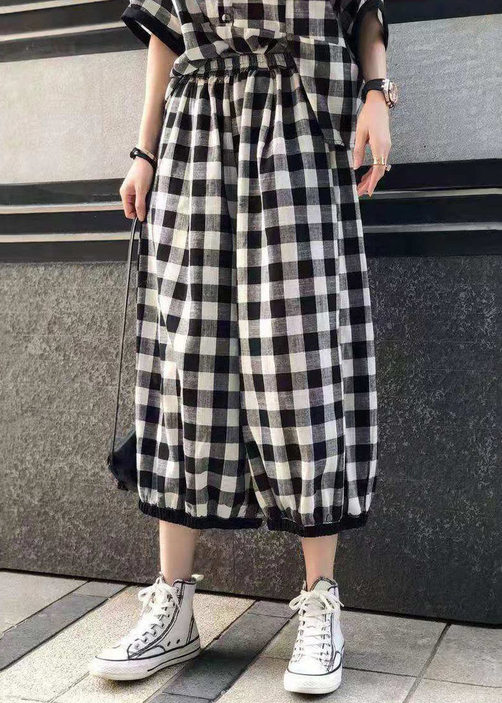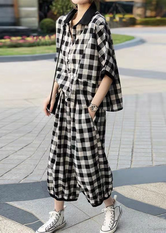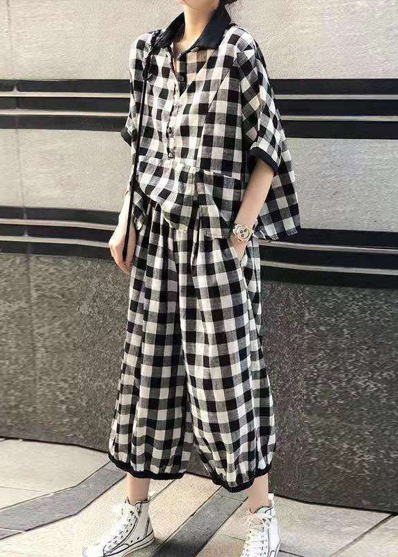 French Plaid Button Pockets Cotton Two Piece Set Half Sleeve AA1035