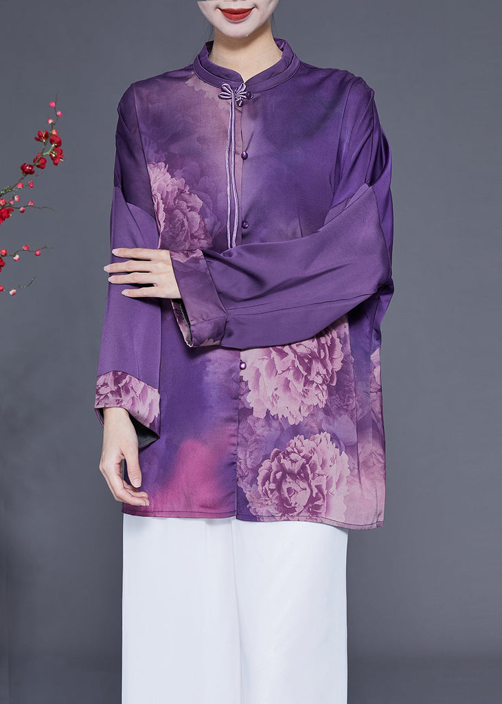 Handmade Purple Stand Collar Tassel Print Silk Shirts Spring
