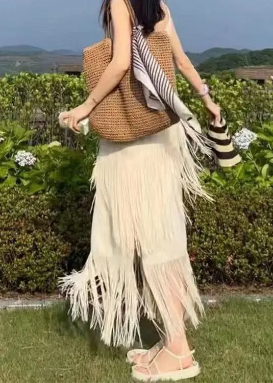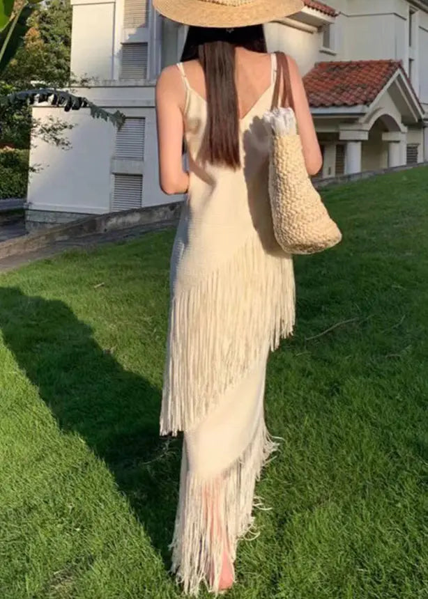 Italian Apricot V Neck Tasseled Patchwork Chiffon Dresses Sleeveless HA1044