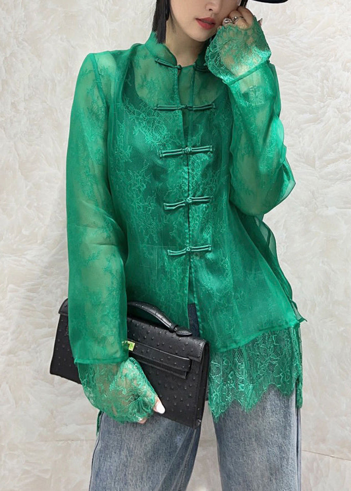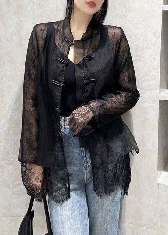 Italian Black Button Lace Patchwork Tulle Shirts Long Sleeve QA1010