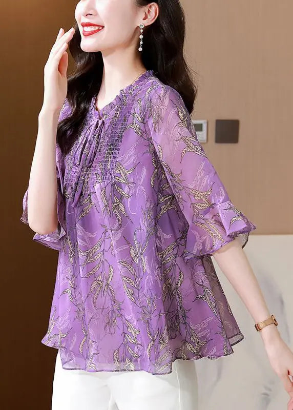 Italian Purple Ruffled Print Chiffon Blouses Summer HA1055