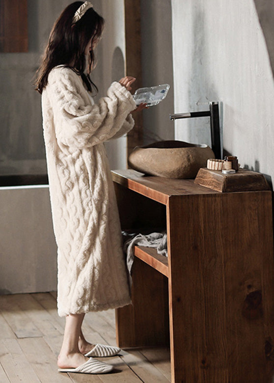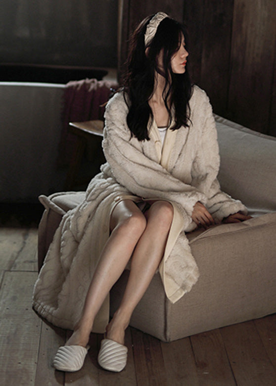 Jacquard Beige V Neck Button Velour Long Robe Spring