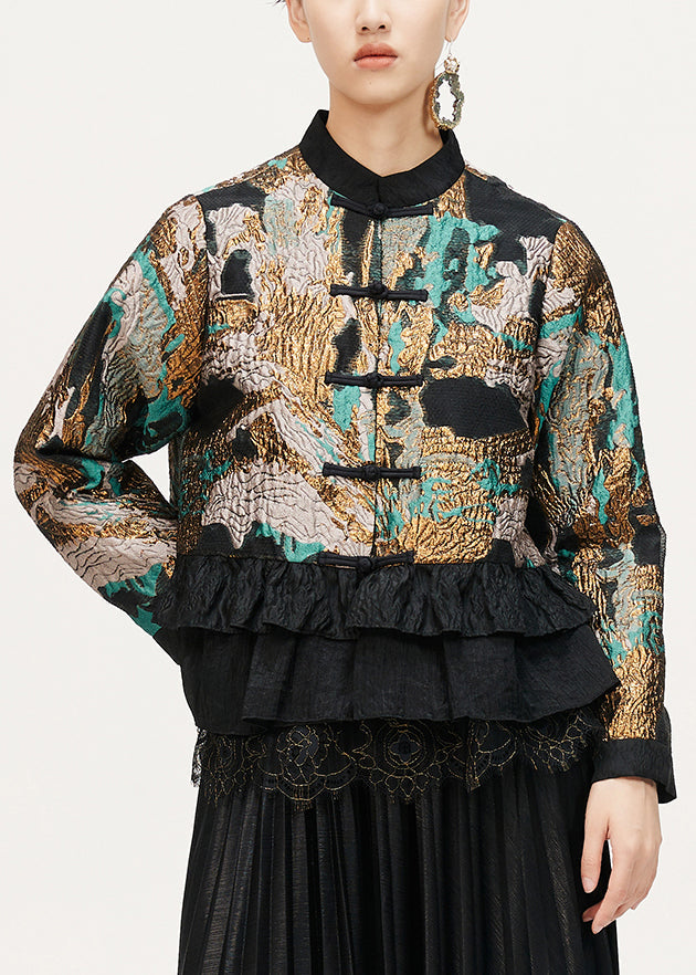 Jacquard Coffee Ruffled Button Cotton Coat Long Sleeve QA1057