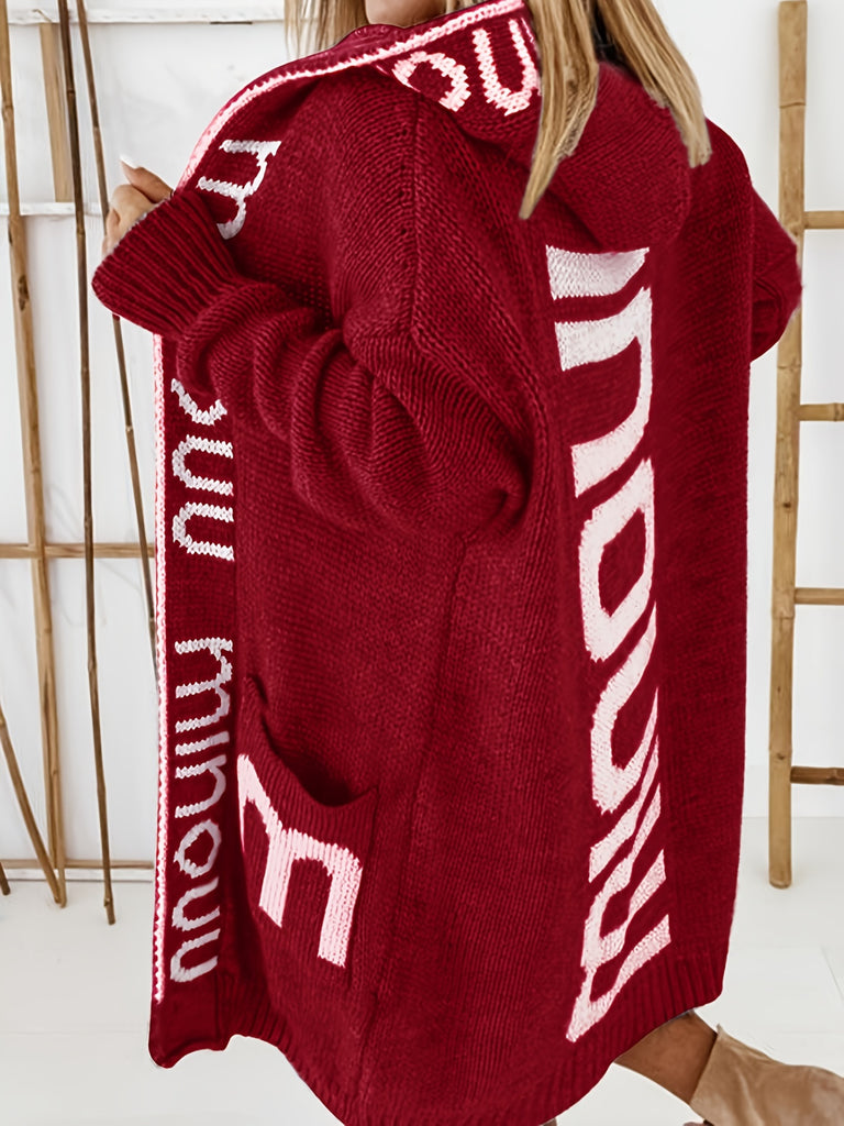 Letter Print Waterfall Collar Knit Cardigan ET8214