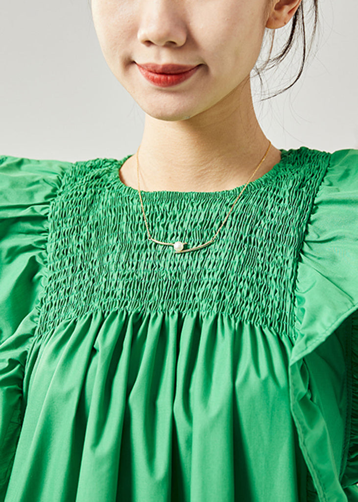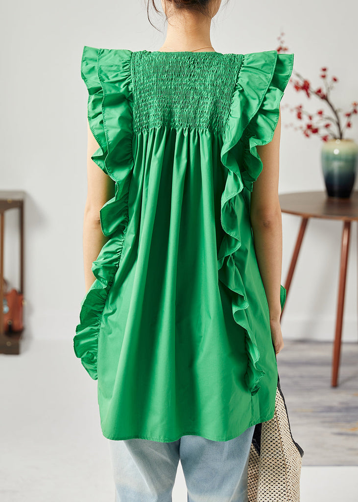 Modern Green O-Neck Wrinkled Patchwork Ruffles Cotton Tops Sleeveless LY1817