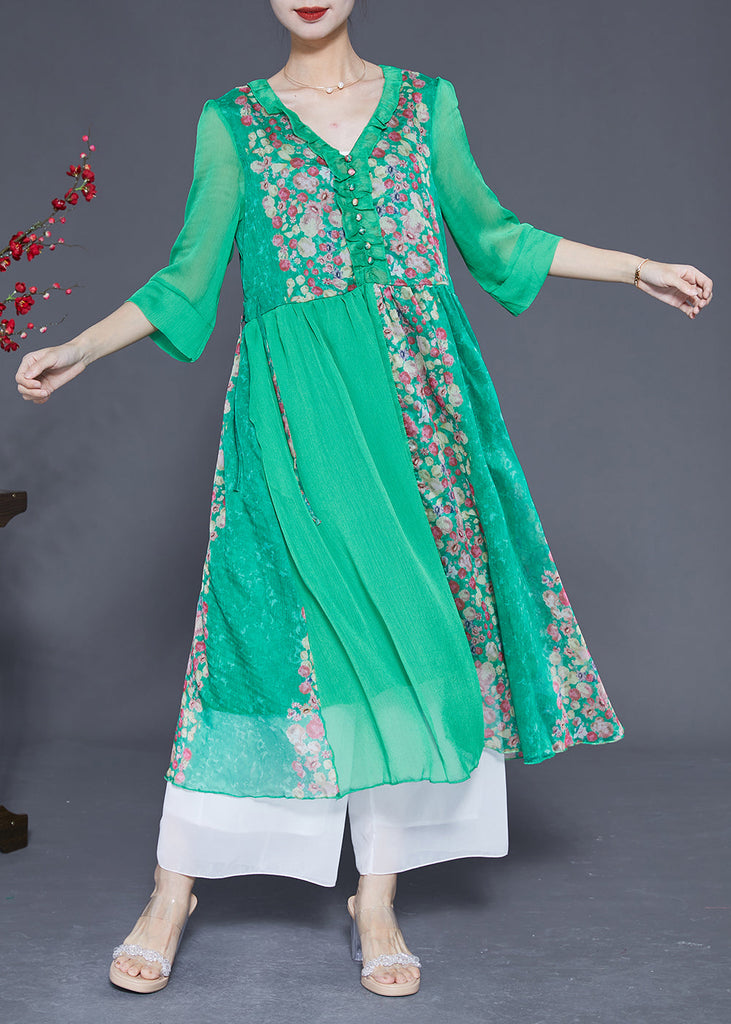 Modern Green V Neck Ruffled Patchwork Print Chiffon Dress Half Sleeve