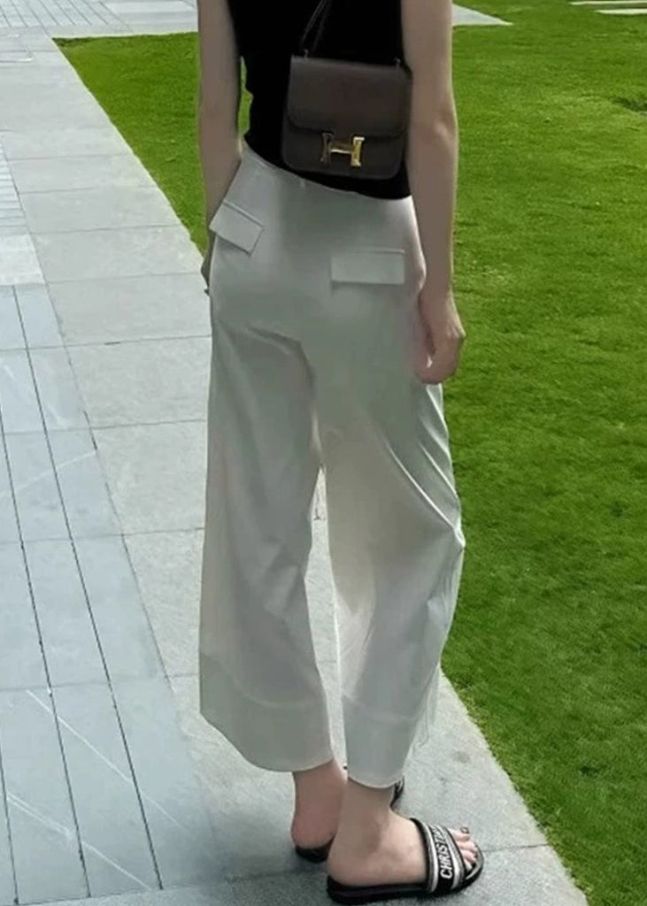 Modern High Crop Summer White Pants Waist Pockets Cotton