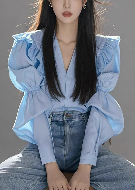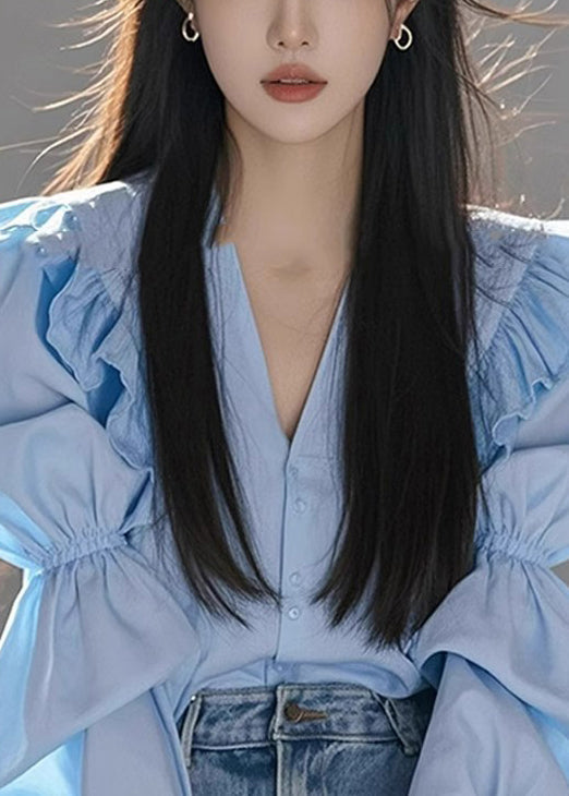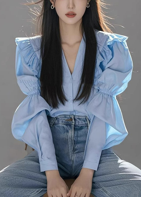 Italian Blue V Neck Wrinkled Cotton Blouse Fall