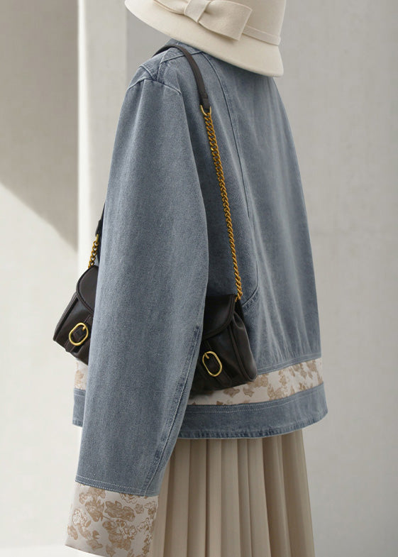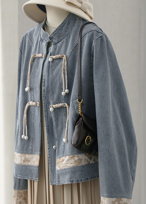 New Blue Stand Collar Button Patchwork Denim Coats Long Sleeve QA1090