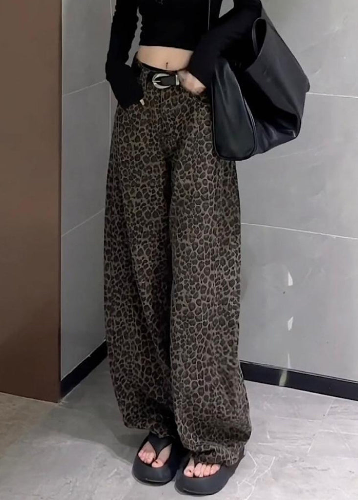 Pants Denim Waist Pockets Leopard Wide Leg High Fall Unique