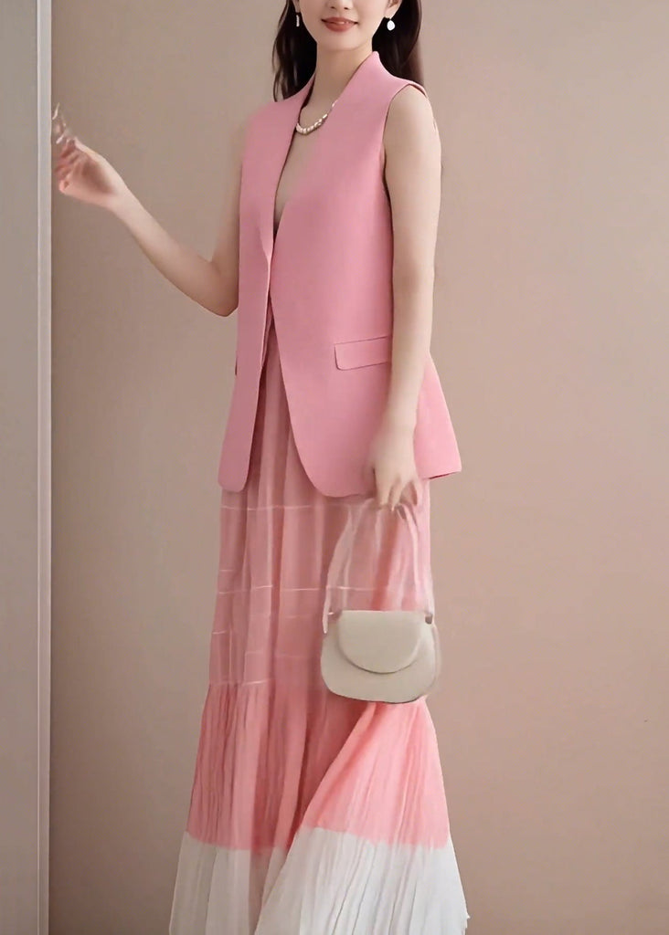 Fashion Pink V Neck Waistcoat And Wrinkled Skirts Two Pieces Set Sleeveless