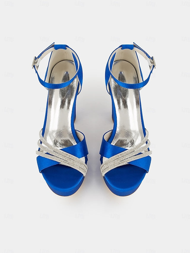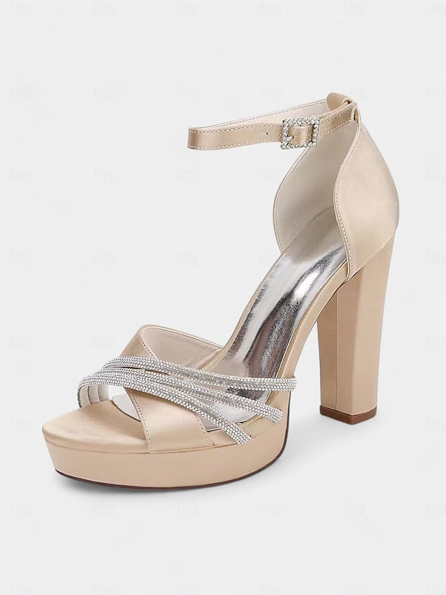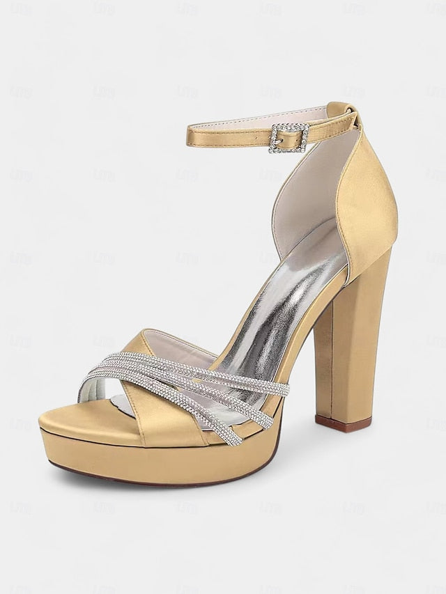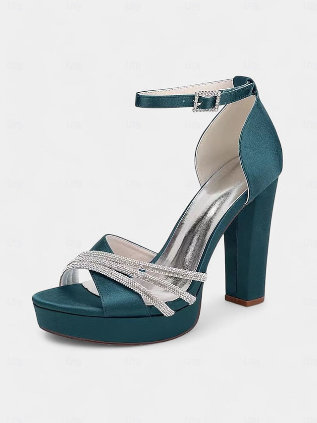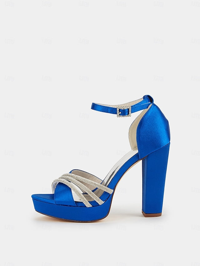 Gender: Women's, Category: Wedding Shoes, Style: Sexy, Type: Bridesmaid Shoes, Bridal Shoes, Wedding Sandals, Wedding Heels, Occasion: Wedding, Toe Shape: Open Toe, Peep Toe, Upper Materials: Satin, Outsole Materials: Foam Rubber, Embellishment: Rhinestone, Season: Winter, Fall, Summer, Spring, Size Suggestion: standard size, select your usual size, Closure Type: Loafer, Heel Height(inch): 4.33, Heel Type: Chunky Heel,