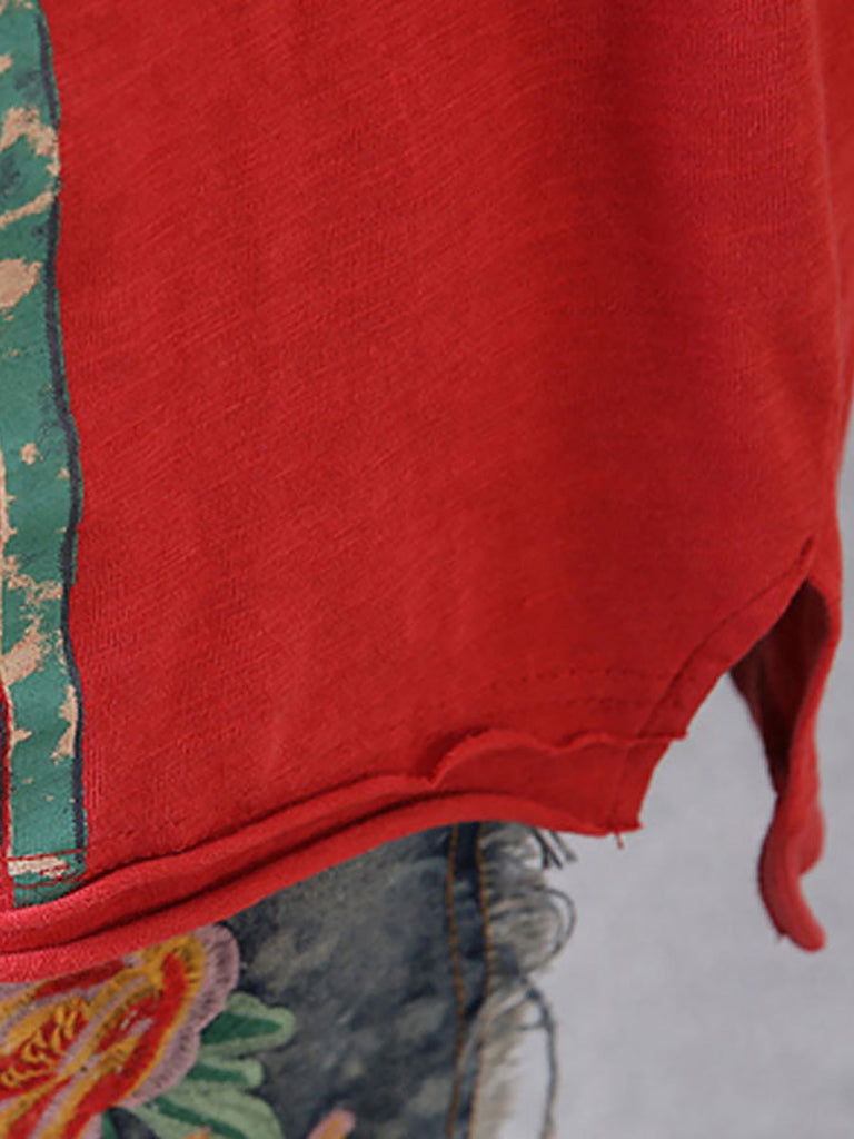 Loose cotton sunflower printed red top, has a round neck, three quarter sleeve, you'll enjoy wearing across spring, summer, autumn.