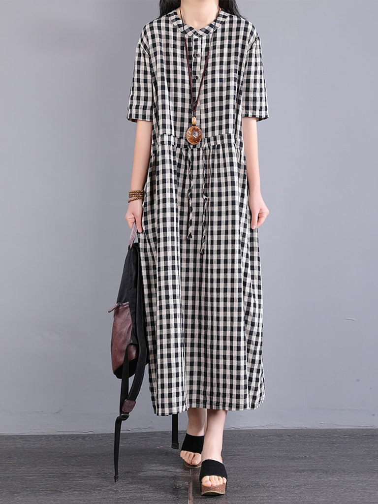 Indulge in the breathability and comfort of this summer's must-have dress. Crafted with a lightweight and airy fabric, this design boasts a timeless plaid pattern and classic O-neck collar. Its short and regular sleeves make it ideal for warm weather, while the adjustable drawstring waist ensures a perfect fit. Stay effortlessly cool and stylish in this luxurious dress during the summer season.