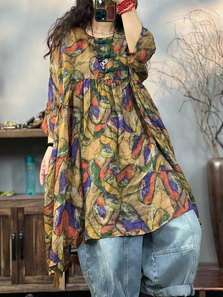 Plus Size Women Ethnic Print Summer 100%Ramie Dress TY1044