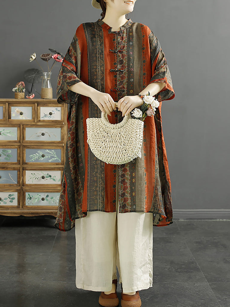 Indulge in the luxurious 100% Ramie fabric, expertly crafted into a timeless stripe pattern. Elevate your wardrobe with the stand collar, three quarter and raglan sleeves, and vintage style, perfect for the spring and summer seasons.