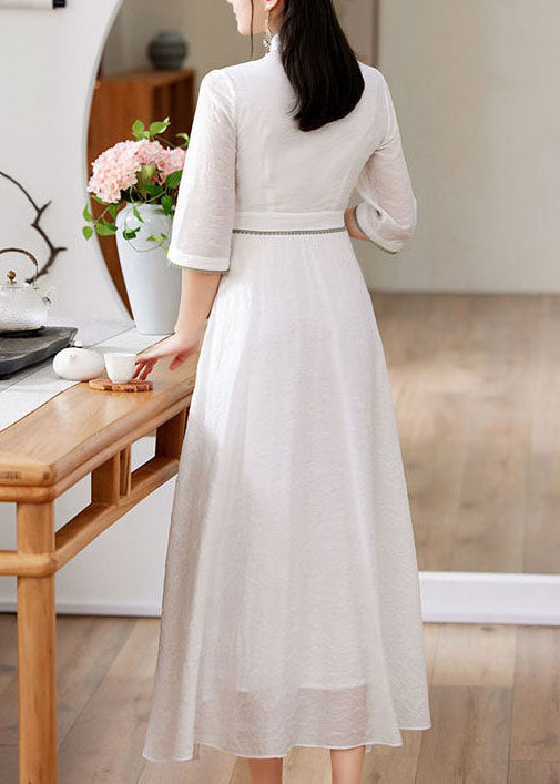 Simple White Stand Collar Embroideried Patchwork Silk Dress Spring